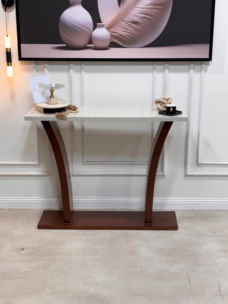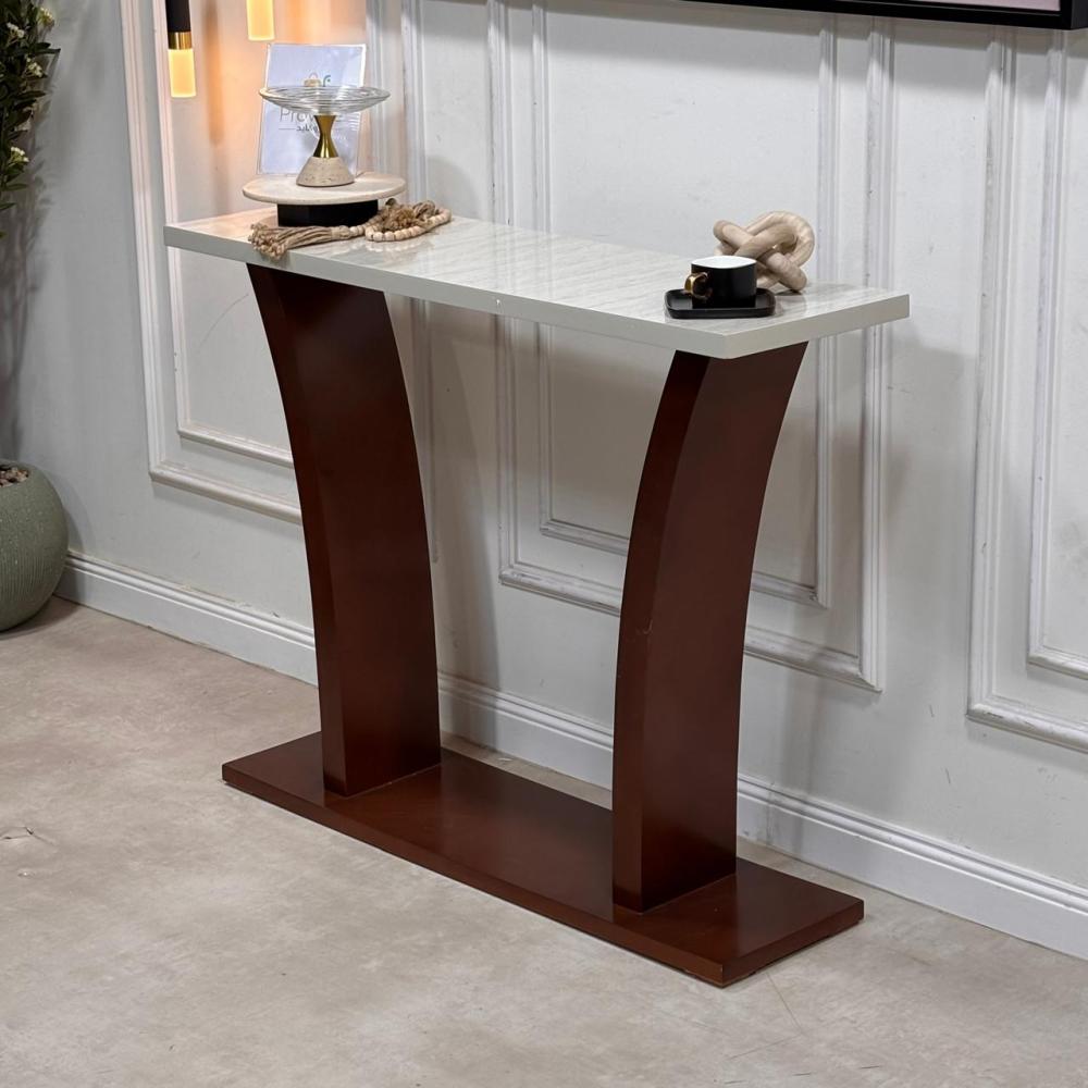طاولة مدخل أو كونسول بتصميم عصري وأنيق. تتميز الطاولة بسطح لامع بلون فاتح، مع قاعدة من الخشب الداكن تشكل شكلًا منحنيًا في الوسط، مما يضيف لمسة فنية على التصميم. يُعتبر هذا النوع من الطاولات مثاليًا للأماكن التي تحتاج إلى إضافة لمسة جمالية مع الحفاظ على البساطة والوظائف العملية، مثل الممرات، أو كقطعة ديكور في الصالونات.