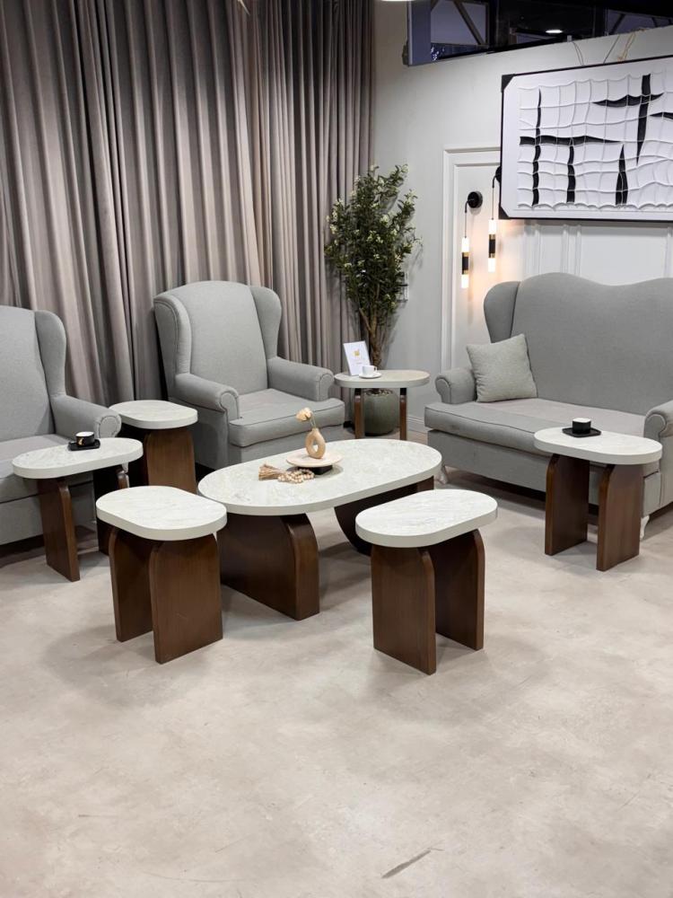 طقم الطاولات في الصورة يتكون من عدة قطع متناسقة التصميم: