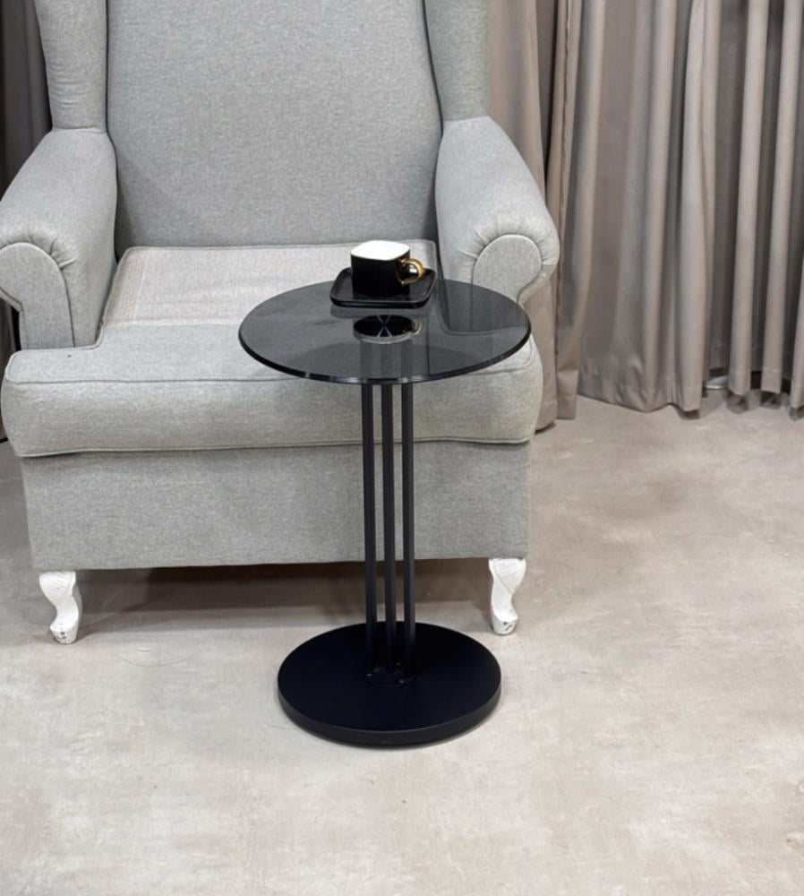 الطاولة في الصورة طاولة خدمة صغيرة ذات تصميم عصري وبسيط. سطحها دائري مصنوع من الزجاج الشفاف، مدعوم بقاعدة عمودية أسطوانية سوداء اللون. القاعدة السفلية للطاولة دائرية وعريضة باللون الأسود أيضًا لتمنحها الثبات. الطاولة أنيقة وخفيفة المظهر، وتناسب الاستخدام بجانب الكرسي أو الأريكة لوضع فنجان قهوة أو أشياء صغيرة.