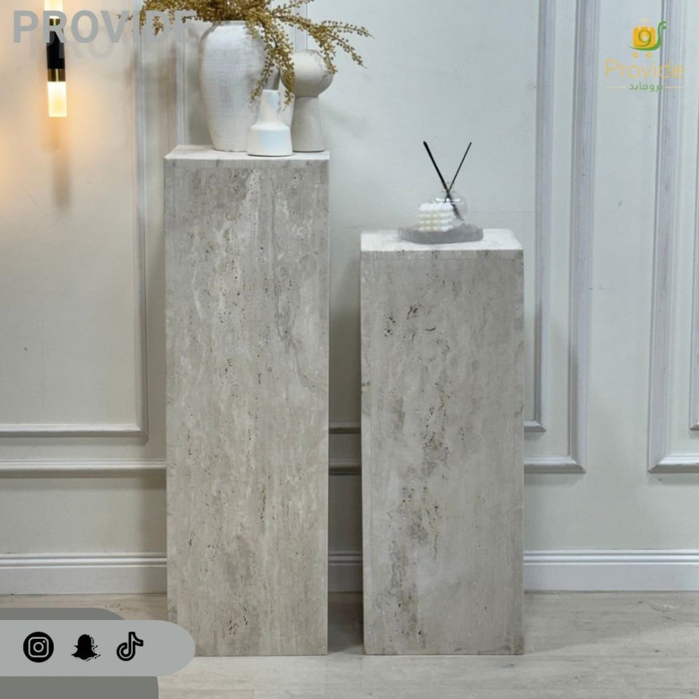 وصف المنتج : مجموعة من عمودين ديكور داخلي أنيقين مصنوعين من حجر الترافرتين الطبيعي، يتميزان بتصميم بسيط وعصري يناسب جميع أنواع الديكورات المنزلية والمكتبية. العمودان مختلفا الطول، مما يضيف بعدًا جمالياً وعمقًا للمكان الذي يوضعان فيه. يمكن استخدامهما كقاعدة لعرض القطع الفنية أو النباتات أو العناصر الزخرفية الأخرى، مما يضفي لمسة من الفخامة والرقي على أي مساحة داخلية. مثالي لوضعه في الصالونات، مداخل المنازل، أو مكاتب العمل.