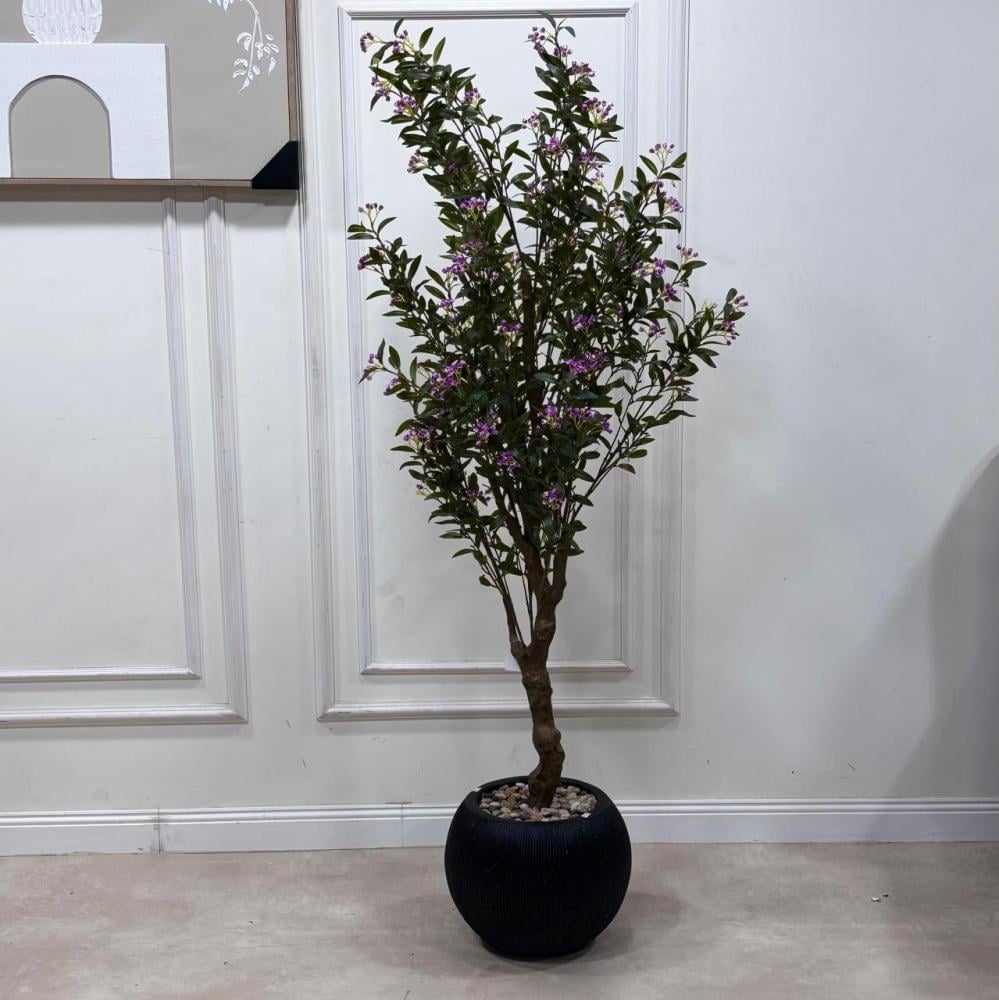 شجرة صناعية فاخرة بتصميم واقعي، تحتوي على جذع بني ملتف يشبه الأشجار الطبيعية، وأوراق خضراء كثيفة تتخللها زهور صغيرة باللون البنفسجي، تضفي لمسة من الحيوية والبهجة على المكان. مزروعة في أصيص دائري باللون الأسود، مزين بالحصى الزخرفي.