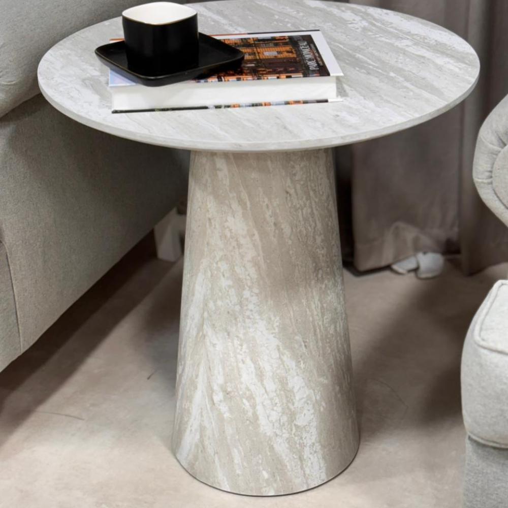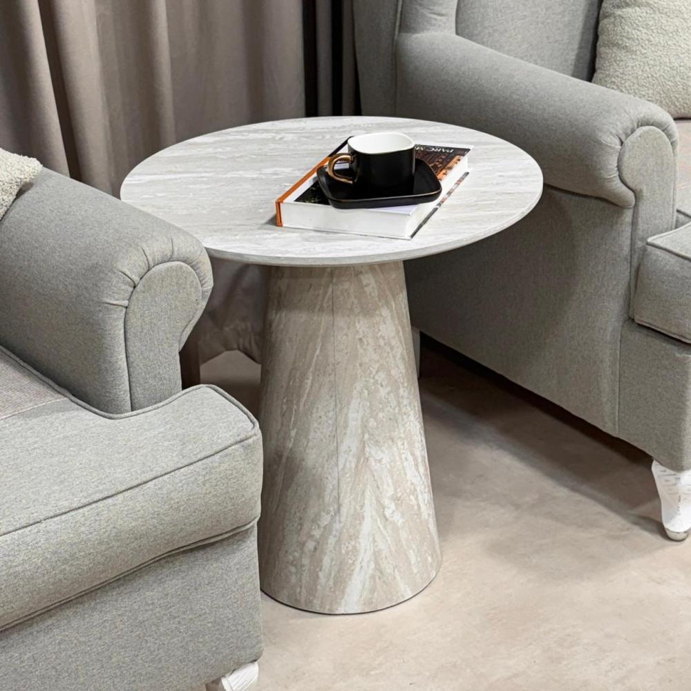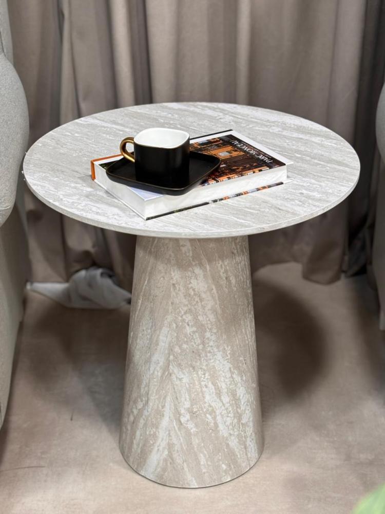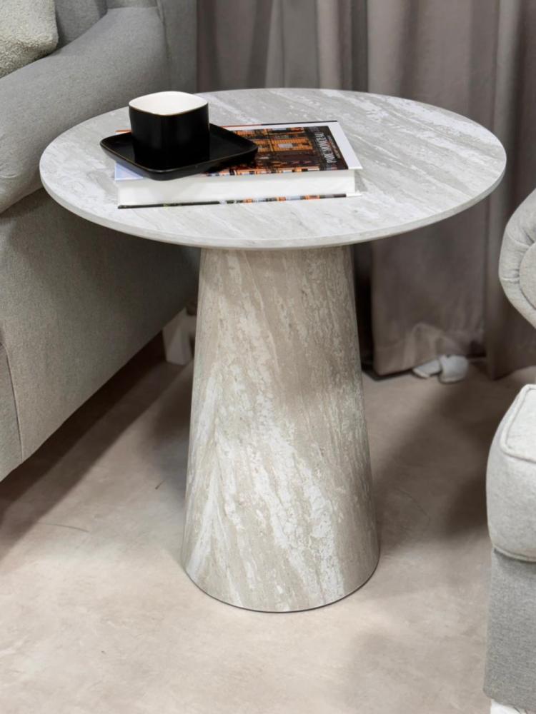 تتميز بسطح دائري وقاعدة مخروطية متصلة، مكسوتين بالكامل بتشطيب يشبه الرخام الطبيعي بدرجات الرمادي الفاتح التي تضيف لمسة راقية ومتناسقة مع مختلف أنماط الأثاث العصري والكلاسيكي.