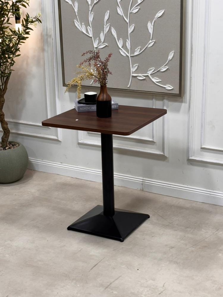 طاولة بتصميم عصري وبسيط. الطاولة تتكون من سطح خشبي بني اللون على قاعدة معدنية ذات تصميم بسيط، حيث القاعدة مربعة الشكل ذات حواف مسطحة. فوق الطاولة توجد بعض العناصر الديكورية مثل كتاب مزين وزهرية صغيرة تحتوي على بعض الزهور الجافة.